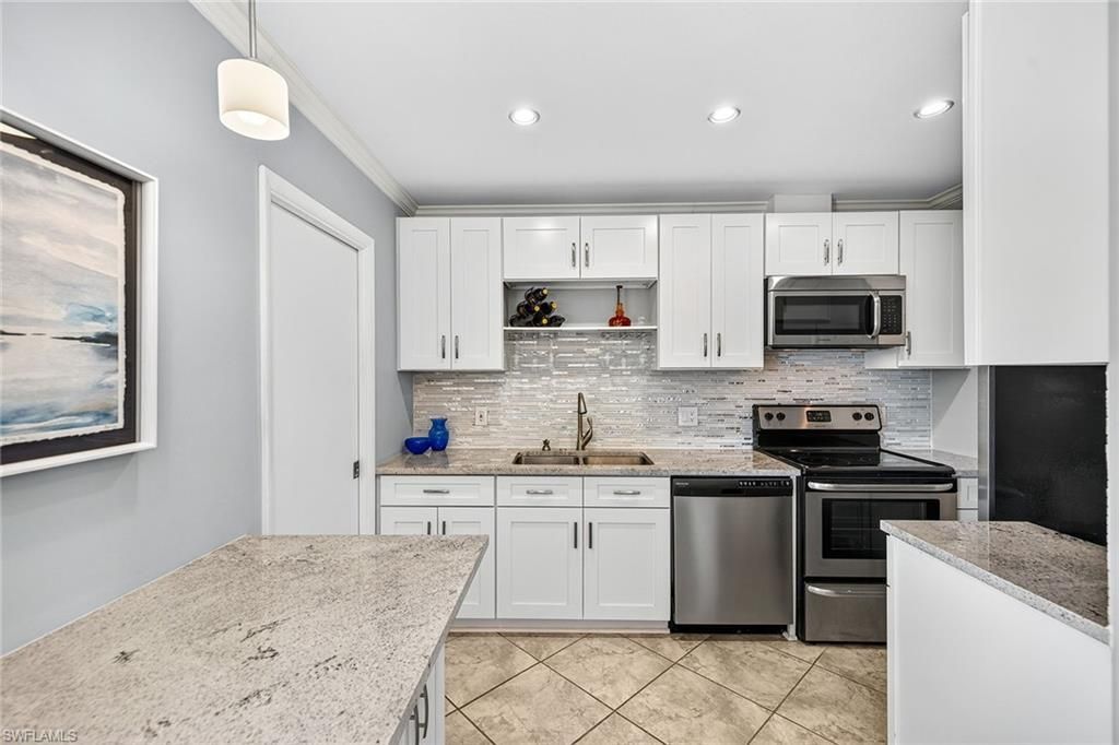 In beautiful Park Shore, this updated top-floor residence offers serene southern exposure with pool and lush landscape views. The home features tile floors throughout, a modern kitchen with quartz countertops, a custom tile backsplash and stainless steel appliances. The spacious primary suite includes crown molding and a renovated bath with a glass-enclosed walk-in shower. A screened lanai, accessible from the living room and bedroom, captures soft sunlight all day while hurricane-rated windows ...In beautiful Park Shore, this updated top-floor residence offers serene southern exposure with pool and lush landscape views. The home features tile floors throughout, a modern kitchen with quartz countertops, a custom tile backsplash and stainless steel appliances. The spacious primary suite includes crown molding and a renovated bath with a glass-enclosed walk-in shower. A screened lanai, accessible from the living room and bedroom, captures soft sunlight all day while hurricane-rated windows and shutters provide peace of mind. Hidden Lake Villas offers resort-style amenities including a library, pickleball and tennis courts, highlighted by the largest community pool in the area, with lap lanes and low entry stairs. Residents can enjoy private access to Park Shore Beach through the Park Shore Association, complete with dedicated parking, showers and picnic areas. Near 5th Avenue South, Venetian Village and Mercato, this location delivers effortless access to Naples signature coastal lifestyle.
